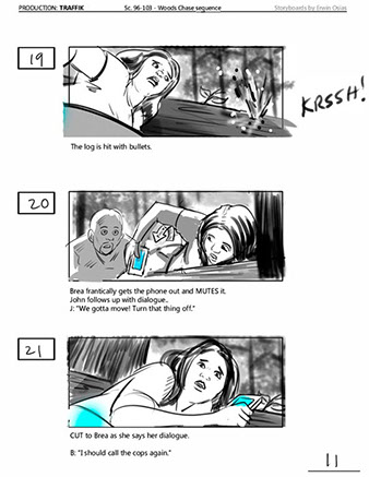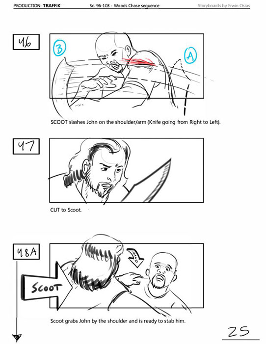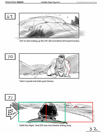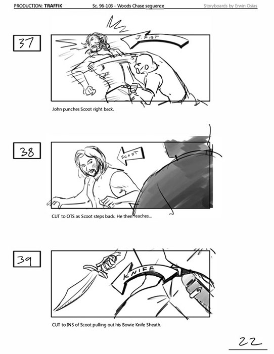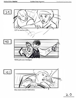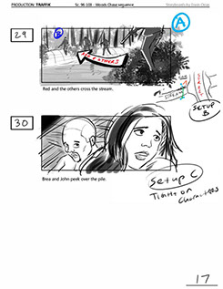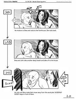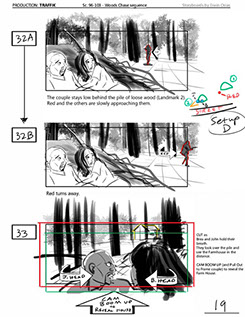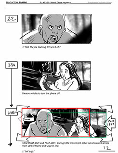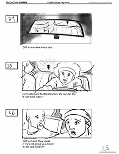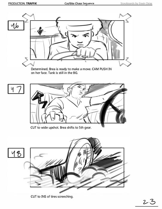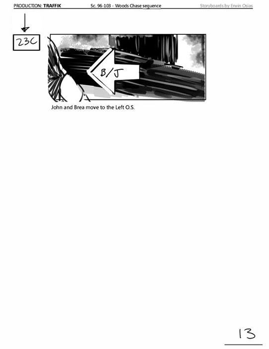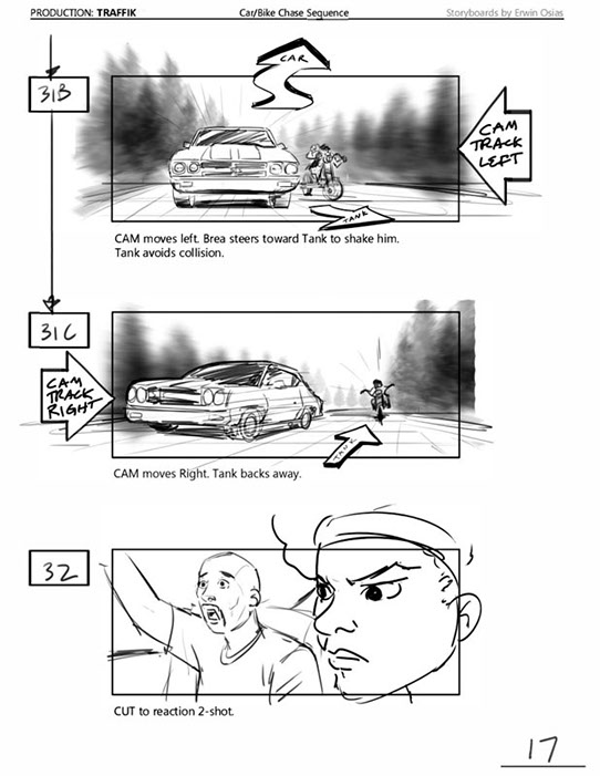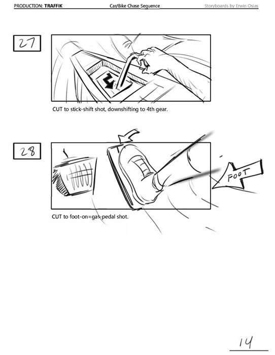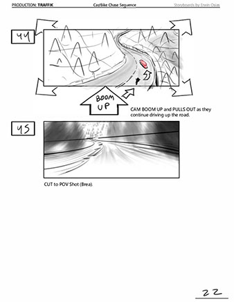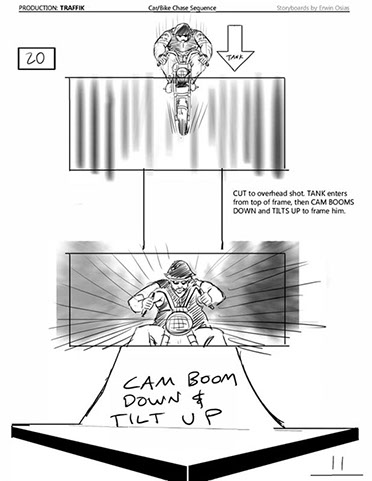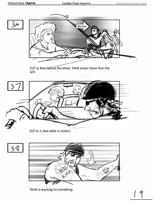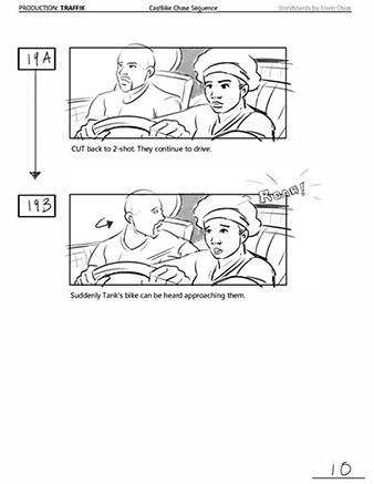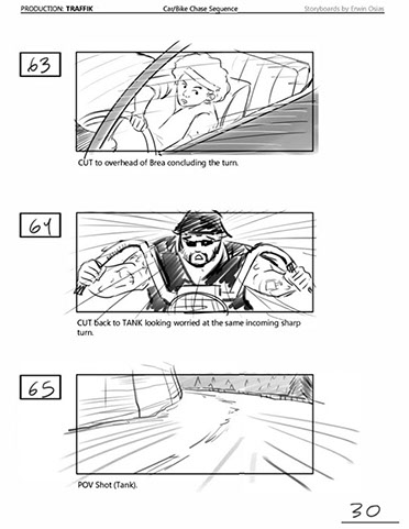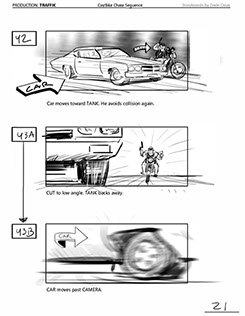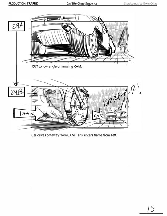 An early first pass on the car/bike chase sequence in the film, with the characters in reverse seating position compared to the final cut of the movie.